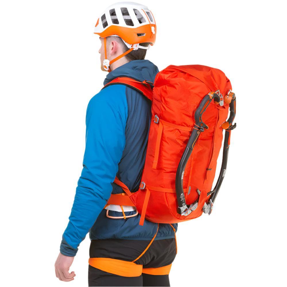 The streamlined hourglass design allows easy packing and stable carry, with an EVA back panel for added support and comfort. The slim, high-density EVA shoulder straps ensure ease of movement for climbing while providing support for long hikes. Aluminium compression straps stabilize the load and accommodate gear like mats or skis, while ice axe toggles and bungee cords enhance carrying options. The back panel, hip fins, and other components can be stripped down for lighter ascents to reduce weight.