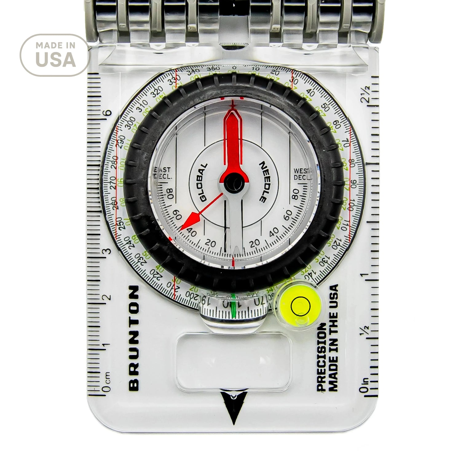 - Bubble level for absolute precision readings; keeping the compass level (not the needle level) is a critical aspect for taking an accurate bearing