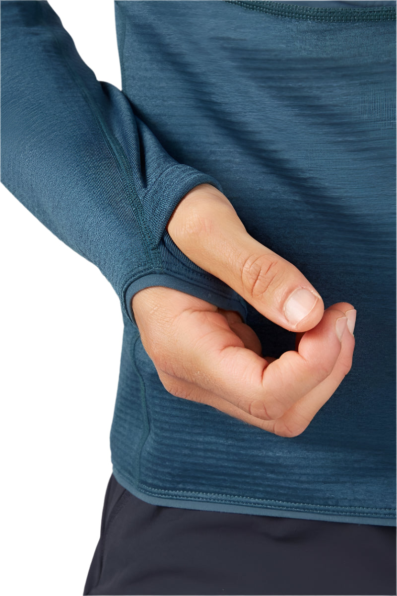Every detail is crafted with vertical movement in mind. The streamlined waist sits neatly beneath a harness, while the under-helmet hood offers additional coverage without bulk. A zipped chest pocket remains easily accessible when wearing a harness, making it the perfect place to store essentials such as snacks or a guide. Elasticated cuffs and hem create a snug fit to retain warmth, while integrated thumb loops prevent sleeves from riding up, particularly when arms are extended for long periods.